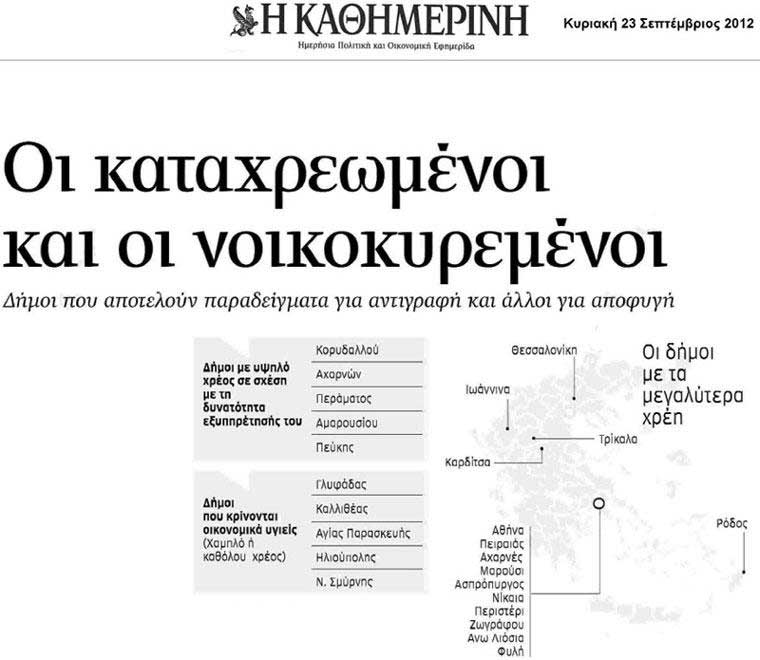 Χαρακτηριστικό είναι το δημοσίευμα της Κυριακάτικης Καθημερινής, 23/9/12, με τίτλο «Οι καταχρεωμένοι και οι νοικοκυρεμένοι», στο οποίο παρατίθενται οι χρεωμένοι και οι υγιείς Δήμοι, όπου ο Δήμος Ηλιούπολης αναφέρεται ως ένας από τους λίγους «νοικοκυρεμένους».